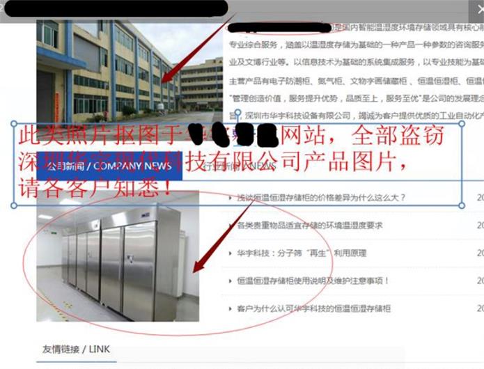 深圳市華宇現(xiàn)代科技有限公司擁有一項恒溫恒濕存儲柜國家發(fā)明專利,和多項相關(guān)的結(jié)構(gòu)新型及軟著專利。產(chǎn)品廣泛用于外資企業(yè),大企業(yè),企業(yè)集團,軍工,醫(yī)藥,博物館,檔案館。最近發(fā)現(xiàn)市面有很多貿(mào)易公司或五金生產(chǎn)廠家,在線下或網(wǎng)絡(luò)上盜用我司的產(chǎn)品資料及圖片進行不良銷售活動。更有甚者以華宇現(xiàn)代的品牌私下接單,但實際銷售的產(chǎn)品卻是不具備恒溫恒濕功能的非我司產(chǎn)品?。ɡ绾蜕钲谑腥A宇現(xiàn)代科技有限公司相似名稱來取名以混淆客戶,更有甚者,其網(wǎng)上全部圖片盜用華宇現(xiàn)代產(chǎn)品圖片,以蒙騙客戶(可以進入華宇現(xiàn)代官網(wǎng)m.yylcn.com比較即知))